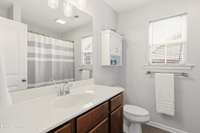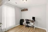 The kitchen boasts warm- toned wooden cabinetry, stainless steel appliances, and a stylish grey tile backsplash. A convenient laundry room adds functionality. The primary suite includes an ensuite bathroom and a walk- in closet for ample storage.