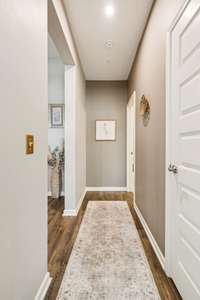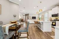 Inside, you’ll find a bright and open living space enhanced by 9- foot ceilings, detailed crown molding, and thoughtfully curated paint colors with eye- catching accent walls. The kitchen is designed to impress with its tall white cabinetry with crown molding, sleek quartz countertops, custom stone backsplash, stainless steel appliances, and a gas range—ideal for both home chefs and casual entertainers.