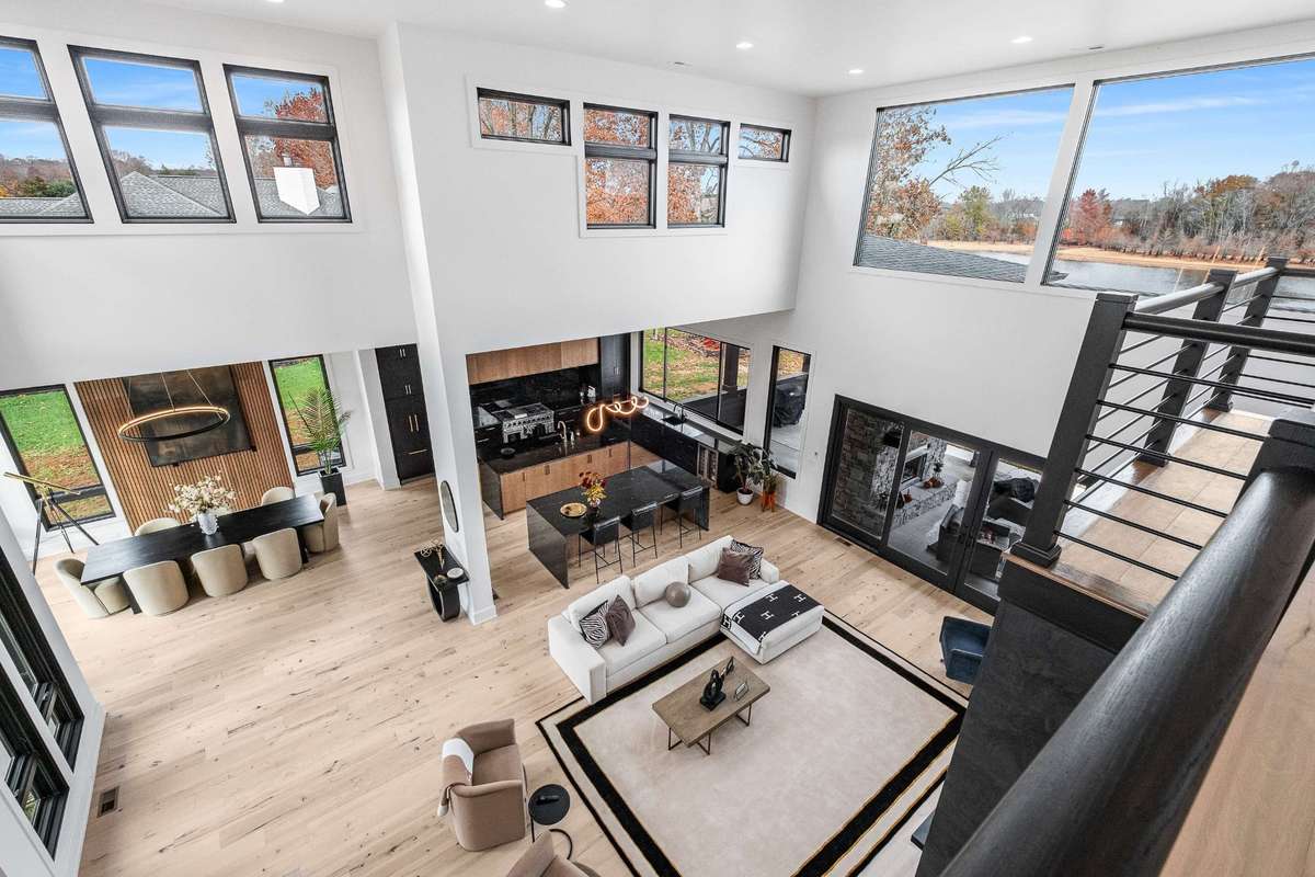 Thoughtfully designed with a warm modern aesthetic, this home embraces its open shoreline setting with soaring ceilings, expansive glass, and seamless connections between indoors and out. Sunlight pours into the integrated living, dining, and kitchen areas, where timeless materials and clean lines create an atmosphere that is both sophisticated and inviting—perfect for gathering with family and friends or indulging in relaxation. Rich hardwood floors, bespoke lighting, and custom finishes elevate every detail. The main- level primary suite is a true sanctuary, framed by floor- to- ceiling windows that capture sweeping lakefront views. Its spa- inspired bath showcases a dramatic soaking tub, dual vanities, an expansive shower, and private dressing room closet. Sprawling spaces also offer a club/ billiard‘s room, home fitness center, auxiliary en- suite bedrooms, and attached 2+ car garage.