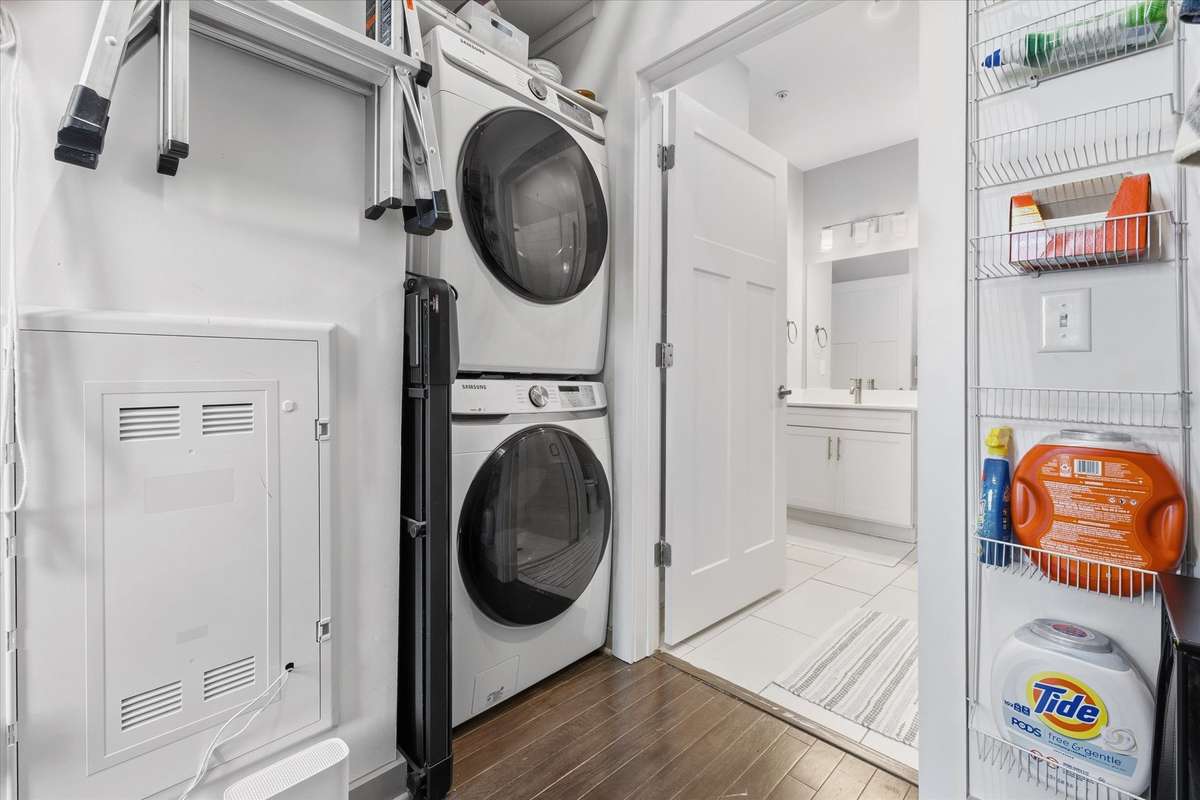 Enjoy true accessibility—this home is wheelchair- friendly and includes thoughtful features for hearing and vision accessibility. Step- free entry, durable flooring ( no carpet!) , and smart layout make it comfortable and convenient for everyone. Storage is a breeze with custom shelving and cabinets throughout, and even a clever pulley- style laundry drying rack. Refrigerator, washer, and dryer all stay—just move right in and enjoy!