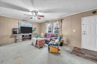 Step inside to discover an open and functional floor plan with a spacious living area, large windows that fill the home with natural light, and a comfortable flow between the kitchen, dining, and living spaces. The kitchen features ample cabinetry, a center island for food prep or casual dining, and easy access to the dining area, making it ideal for both everyday meals and entertaining.
