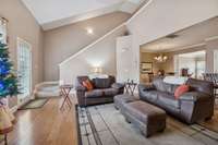 Step inside to a bright, welcoming entry that flows into a spacious dining area and an inviting living room featuring vaulted ceilings, abundant natural light, and a cozy gas fireplace—perfect for relaxing evenings or hosting friends. The open kitchen has warm cabinetry, ample counter space, stainless appliances, an island with seating, and a neutral tile backsplash that complements any décor.