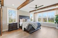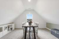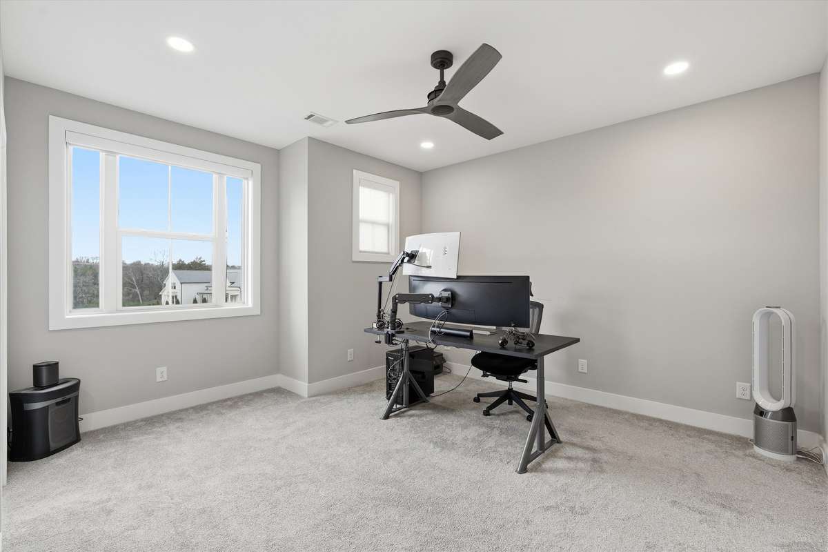 Upstairs, you’ll find three additional bedrooms, two full bathrooms, including a Jack- and- Jill bathroom, a dedicated office, and a large bonus room offering flexible space for media, play, or work. The home also includes a three- car garage for extra storage or parking.