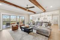 Located in the desirable Hickory Pointe lakefront community, this beautifully appointed home offers an ideal layout with two bedrooms on the main floor, including a spacious primary suite, plus a private guest room with a full bath. The inviting entry opens to a formal dining room with board- and- batten detailing, leading into an open- concept living area filled with natural light. The kitchen stands out with white shaker cabinetry, quartz countertops, a gas cooktop, and an impressive hidden walk- in pantry tucked behind cabinet- style doors.