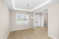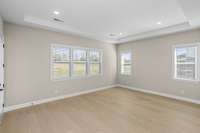The main level features soaring ceilings, hardwood floors, and a wide entry that flows past a grand formal dining room—ideal for holiday dinners. Two guest suites with a Jack and Jill bath welcome visitors, while the private primary suite offers a spa- like retreat with convenient laundry access.