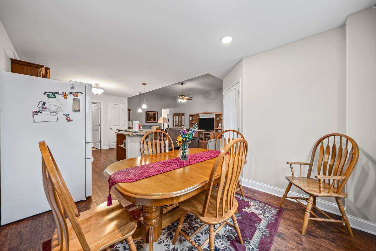 Step through the foyer into an open floor plan. The first thing you' ll notice are the stunning waterproof laminate floors that flow throughout the entire home, complemented by soaring ceilings that create a light and airy main living space. The spacious eat- in kitchen easily accommodates a six- piece dining set and features custom cabinetry with lower- level drawers, granite countertops, and a dedicated built- in chopping block. French Door refrigerator and all built- in kitchen appliances to convey.