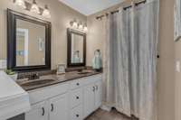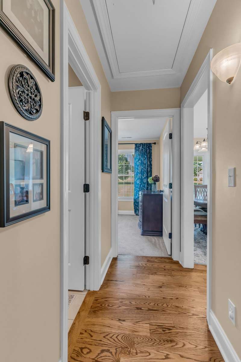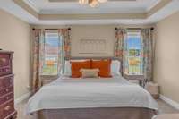 The primary suite features a trey ceiling, walk- in closet, and an ensuite bath complete with a walk- in shower and separate soaking tub. A large bonus room is found above the garage. Additional highlights include real hardwood floors, a 2- car garage, and a beautiful, large, covered back porch —perfect for relaxing outdoors.