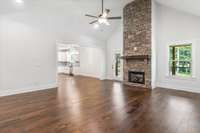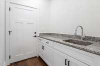 Step inside to an inviting open floor plan featuring rich hardwood floors, a striking stone fireplace with gas logs, and a stylish kitchen equipped with stainless steel appliances and granite countertops, plenty of custom cabinets hroughout. There is even ae spacious wet bar/ laundry area sink for added functionality.