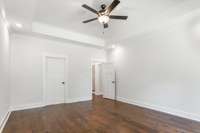 Extensive crown molding and detailed trim work throughout the home reflect the builder' s commitment to quality and craftsmanship. All three bedrooms are conveniently located on the main level, each with hardwood flooring. The primary suite features a tray ceiling, recessed lighting, ceiling fan, walk- in closet, and a luxurious en- suite bath complete with double vanities and a large, tiled walk- in shower.
