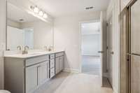 Homesite # 107 - " The Bartlett" - Create memories when you step inside the five- bedroom Bartlett plan. This two- story home features a versatile flex room off the foyer, a covered patio off the dining area, and a bedroom on the main level ideal for guests. The open, designer- curated kitchen overlooks the spacious living room and features professional curated design finishes. Here, you' ll find gorgeous cabinetry, brushed nickel hardware, white quartz countertops, tile backsplash, and stainless appliances. On the second floor, a large loft area offers space for a media room, play room, or home office. The primary suite has a generous walk- in closet, tiled walk- in shower, and a dual vanity. Upgrades include tray ceiling in the owners suite, and a covered patio. Three secondary bedrooms, a full bathroom, and a laundry room with storage closet complete the second floor. Ask listing agent about current incentives. Photos are of the same floorplan on a different homesite. Design Choices may differ.
