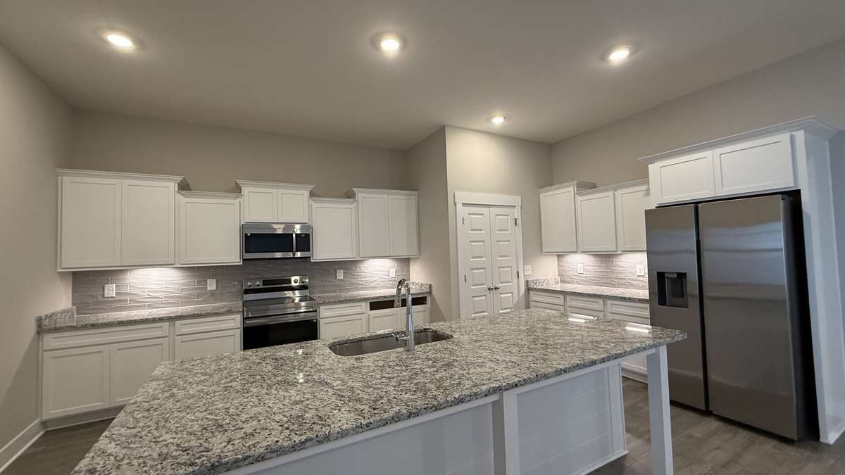 1 story, 2 bedroom, 2 bath, combo great room breakfast & kitchen, covered back porch, 6 ft fence-patio & gate, Blinds, stainless kitchen appliances & refrigerator, tile kitchen backsplash, under cabinet lighting, laminate, carpet, & tile!