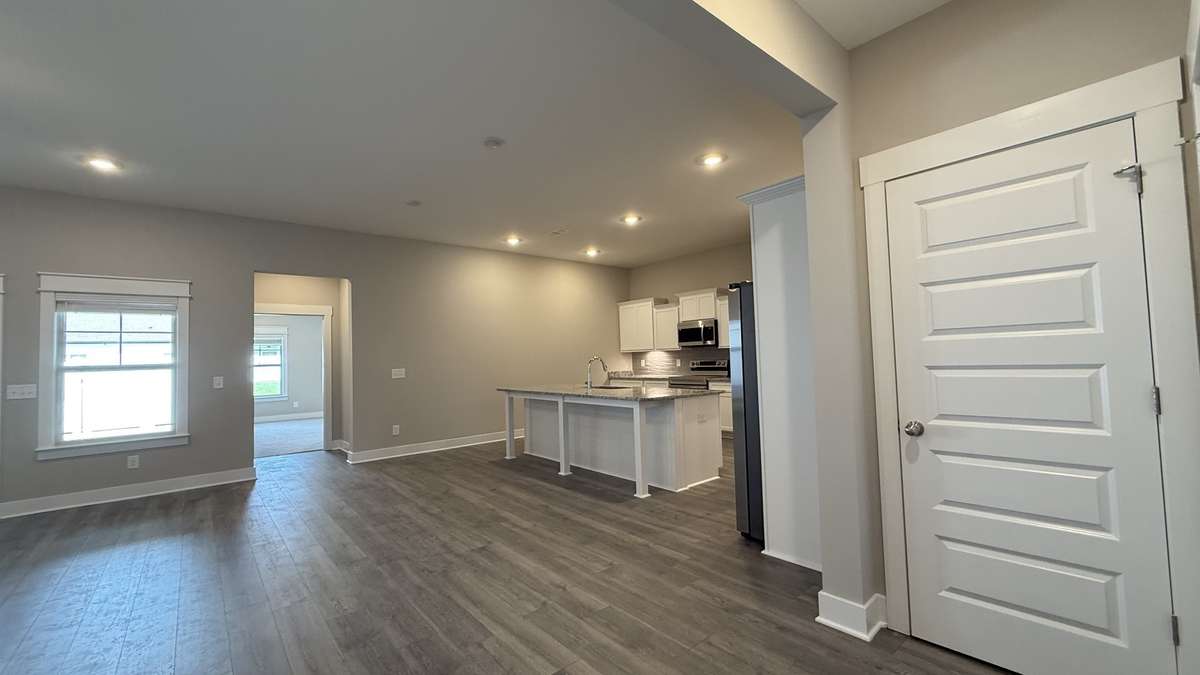 1 story, 2 bedroom, 2 bath, combo great room breakfast & kitchen, covered back porch, 6 ft fence-patio & gate, Blinds, stainless kitchen appliances & refrigerator, tile kitchen backsplash, under cabinet lighting, laminate, carpet, & tile!