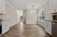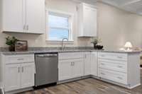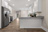 The open layout flows into a bright, inviting kitchen finished with granite countertops, white shaker cabinets, shiplap accents and a full Frigidaire stainless- and- black appliance package - range, microwave, dishwasher, and refrigerator already in place.