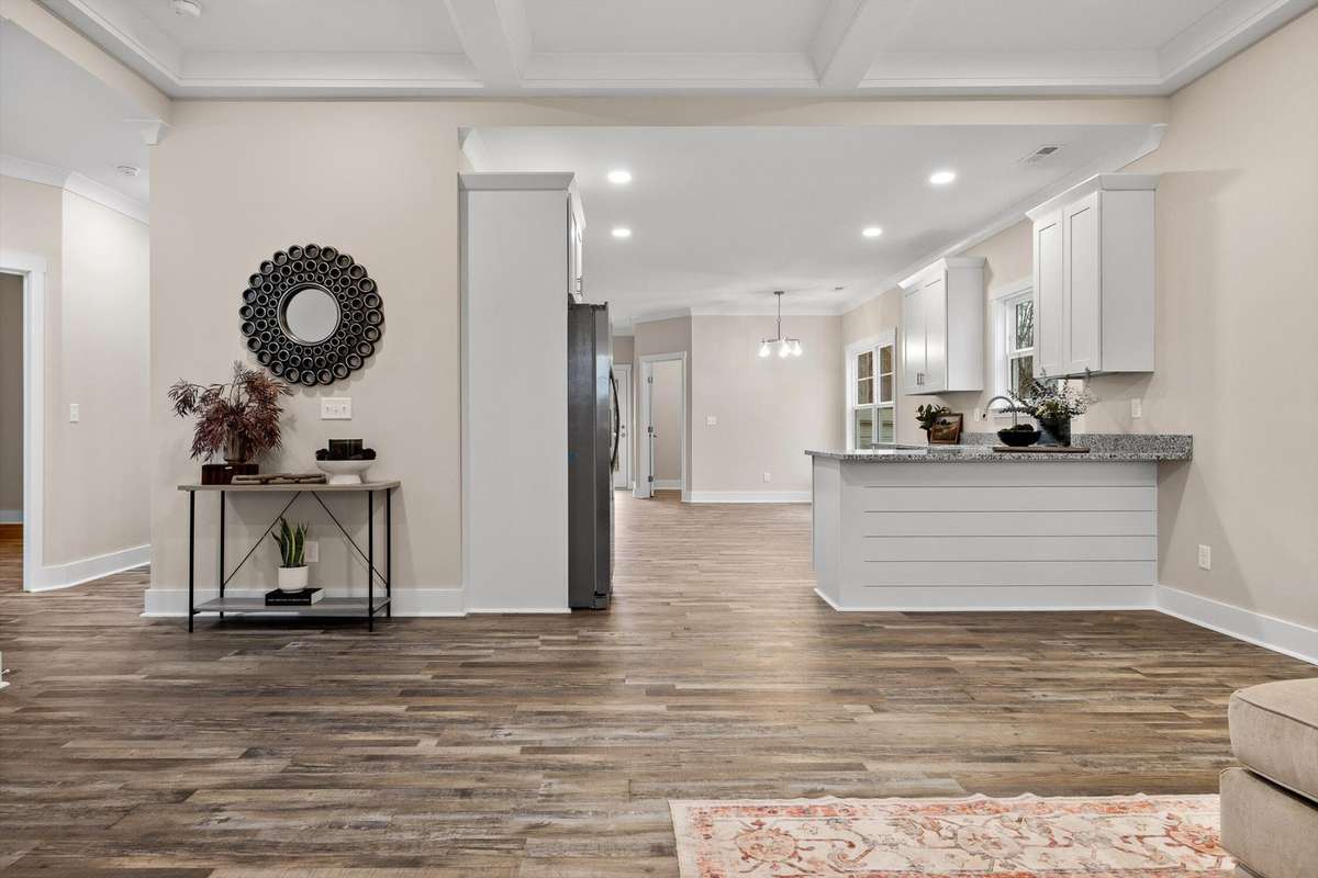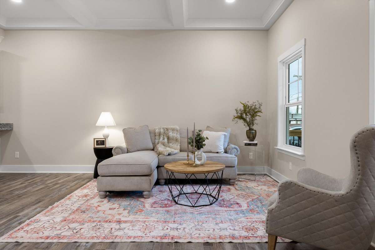 Inside, the living room features a beautiful coffered ceiling that gives the space a warm, custom touch.