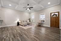 Inside, the living room features a beautiful coffered ceiling that gives the space a warm, custom touch.