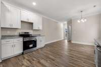 The open layout flows into a bright, inviting kitchen finished with granite countertops, white shaker cabinets, shiplap accents and a full Frigidaire stainless- and- black appliance package - range, microwave, dishwasher, and refrigerator already in place.