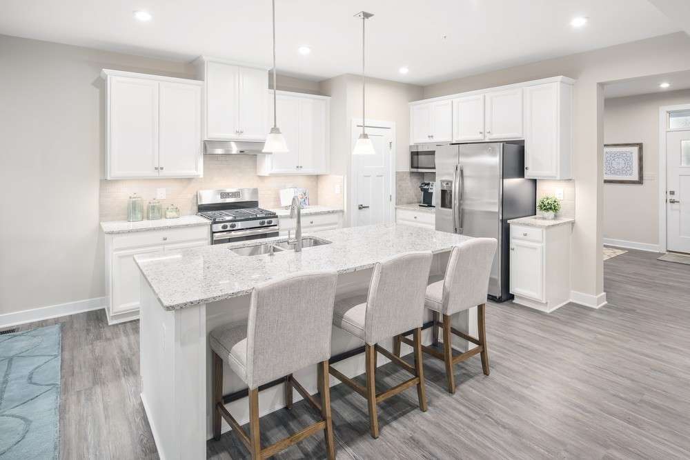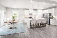 The heart of the home is a spacious entertainer’s kitchen featuring a massive 10- foot island, perfect for gatherings, cooking, or casual dining. The open- concept design flows seamlessly into the living room, creating a warm and inviting atmosphere.