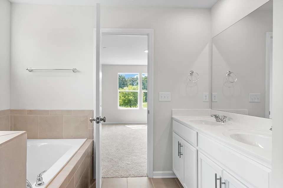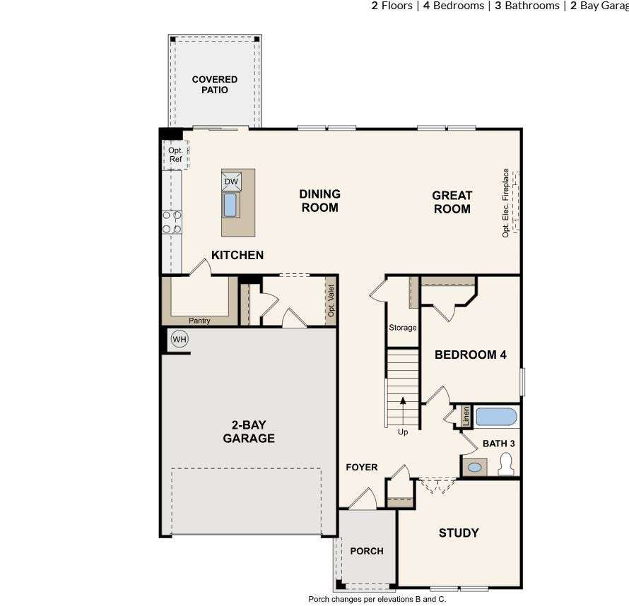 A main- level bedroom and full bath make hosting guests or giving a teenager their own space easy. Upstairs, a versatile loft adds extra flexibility—use it as a play area, media room, or second living space. Iron spindles line the staircase, adding a touch of modern style, while the spacious owner’s suite features a walk- in closet and private bath retreat. Two additional bedrooms and a convenient upstairs laundry complete the layout.