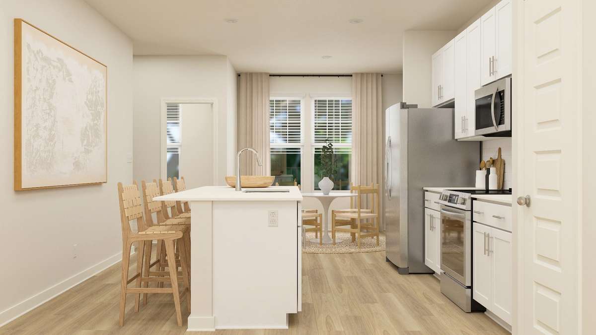 This Gatlinburg floorplan features a spacious great room, dining room, and kitchen for entertaining friends, with 2 bedrooms, 2 full baths, plus a half bath. The kitchen is designed with a huge island for seating, 42" shaker style cabinetry, quartz tops, tile backsplash, and stainless steel kitchen appliances. A luxurious primary suite with ceramic tile floor, executive height cabinets, double vanity and quartz top, and oversized walk- in ceramic tile shower. Generously sized second bedroom with private bathroom. LVP flooring in main living areas, LVT in secondary baths and laundry. Luxurious features throughout! Ring doorbell, Schlage keyless entry, Honeywell WIFI thermostat, and more! 2" faux wood blinds on operable windows and stainless steel refrigerator included!