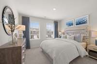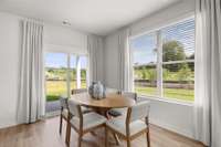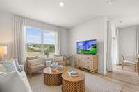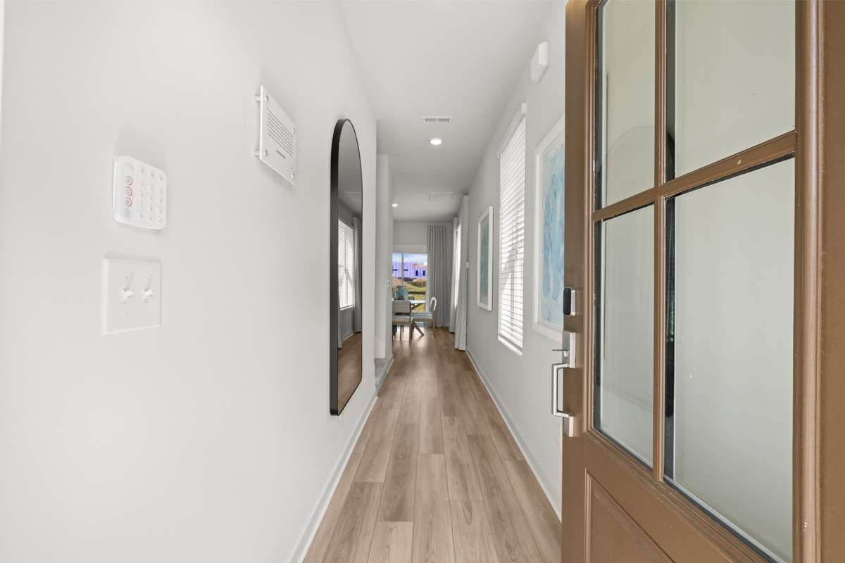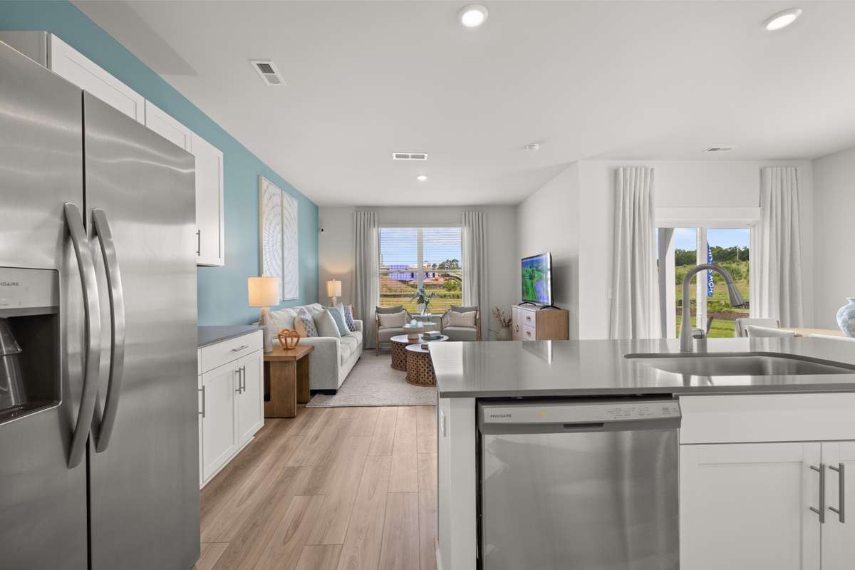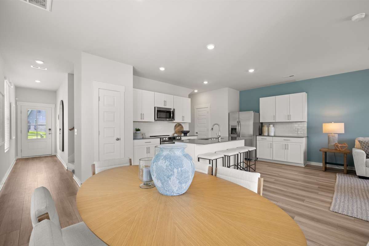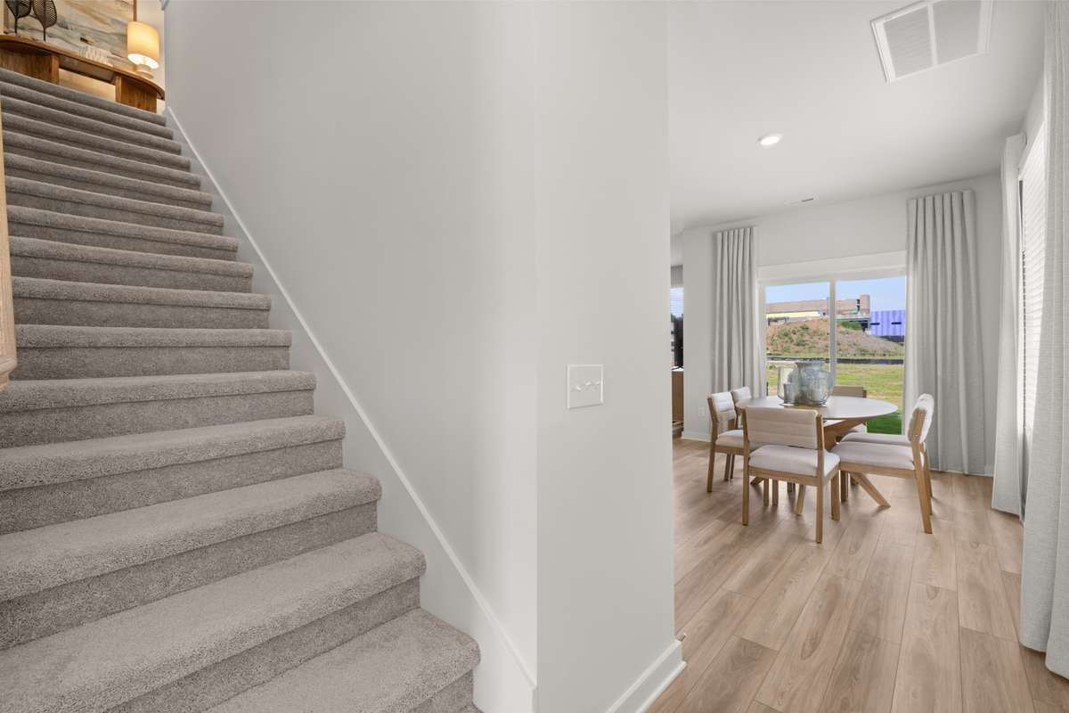 This new two- story townhome design combines comfort and style. The first floor features an open- concept layout connecting a living room for shared moments, a dining room for memorable meals and a kitchen for inspired cooks. Nearby sliding glass doors provide access to a covered patio for outdoor enjoyment. On the second floor, two secondary bedrooms and a spacious owner’s suite with a luxe bathroom and large walk- in closet provide restful retreats for family members and overnight guests. * Images from a furnished model of this home. Actual configuration and features may vary.