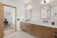 The guest house includes a full kitchen, bedroom, bathroom, and a bonus space that works perfectly as a home office, studio, or gym. The outdoor layout is built for entertaining, with a private garden courtyard, pool, and multiple gathering areas.