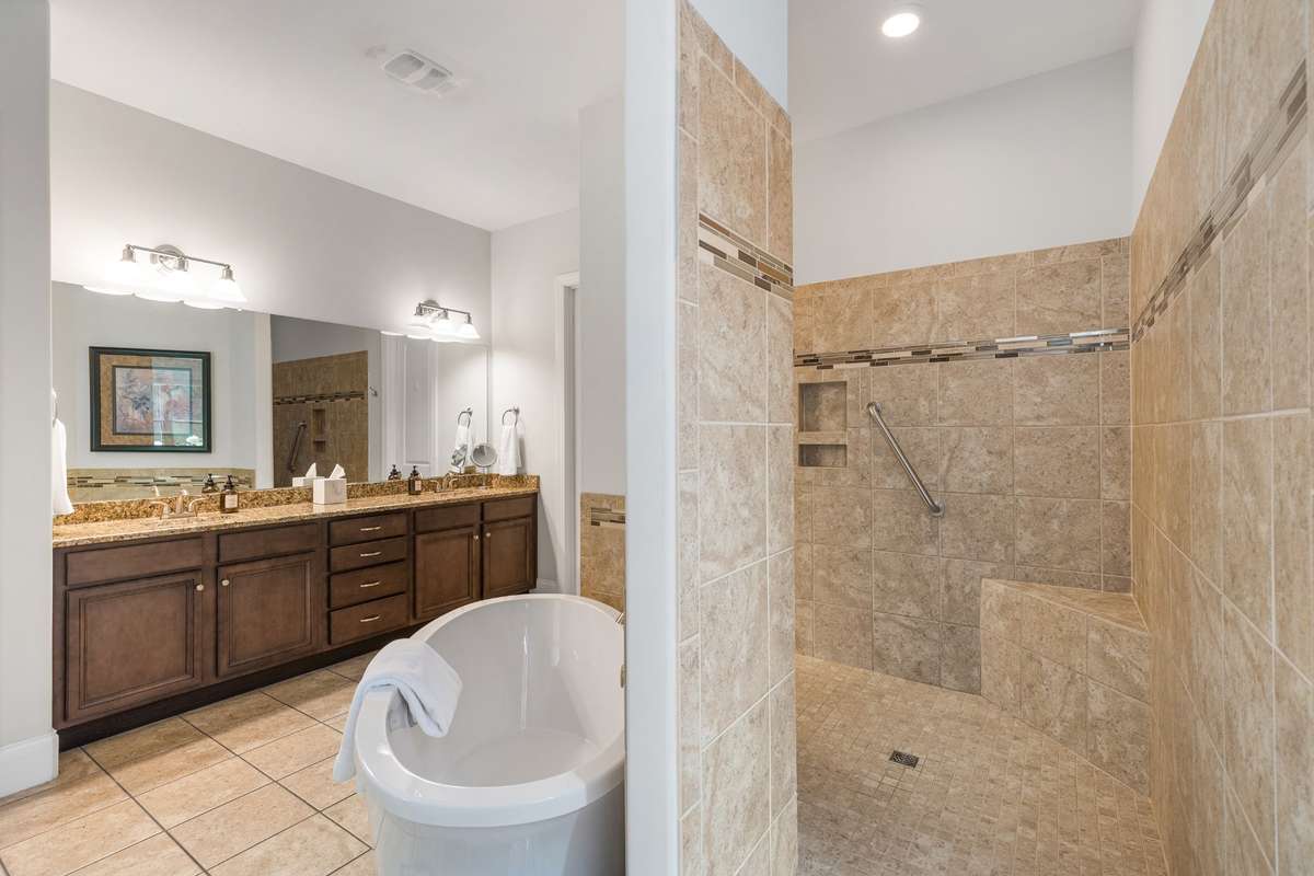 Primary Suite on Main Level: Spacious and convenient, the primary bedroom offers a peaceful retreat with easy access. Garden tub and wraparound walk in shower in the en suite bath. Double vanity and double closets!
