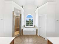 a large island. The generous master suite offers a split vanity and a separate shower for
