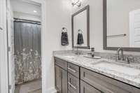 The gorgeous kitchen includes a 36” gas stove, fridge, dishwasher and microwave.