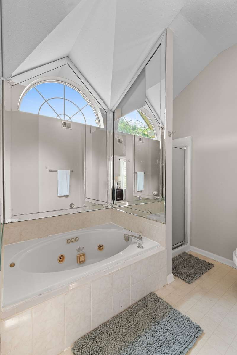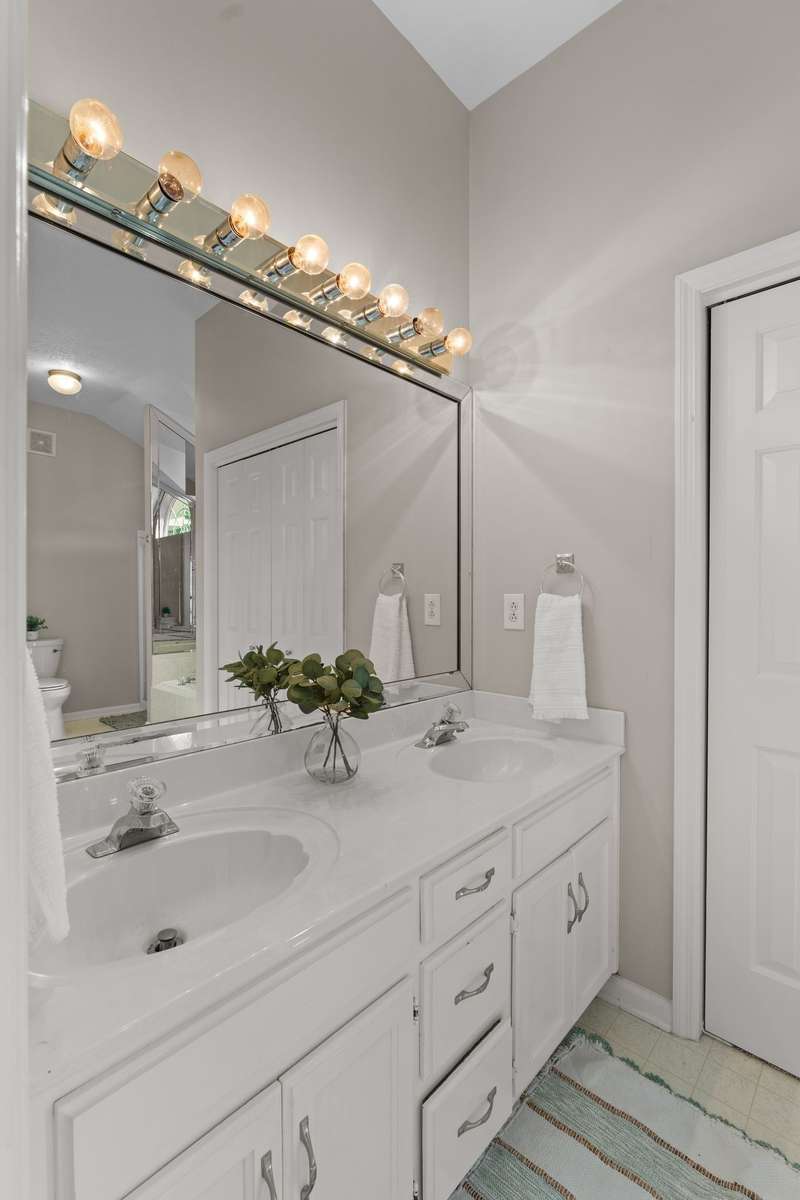 Primary bathroom with double sinks, separate shower, and bath. Closet and bathroom has closet system in place.