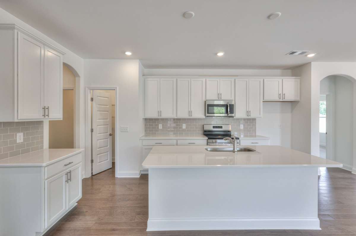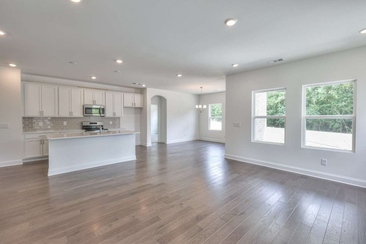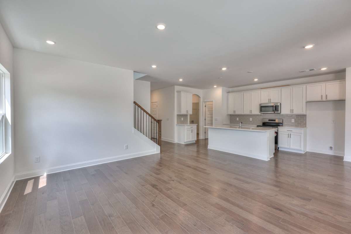 The open- concept main level is designed for easy living and effortless entertaining. The kitchen offers abundant countertop space and flows seamlessly into a large great room, creating an inviting and functional layout. Wood stairs add warmth and elegance as you move through the home.