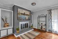 Upon entering, you' ll be greeted by a warm and inviting living area, highlighted by a stunning wood- burning fireplace, ideal for cozying up on chilly days.