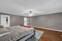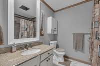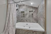 The primary bedroom offers a serene retreat, featuring a walk- in closet and private bath with a luxurious spa tub.