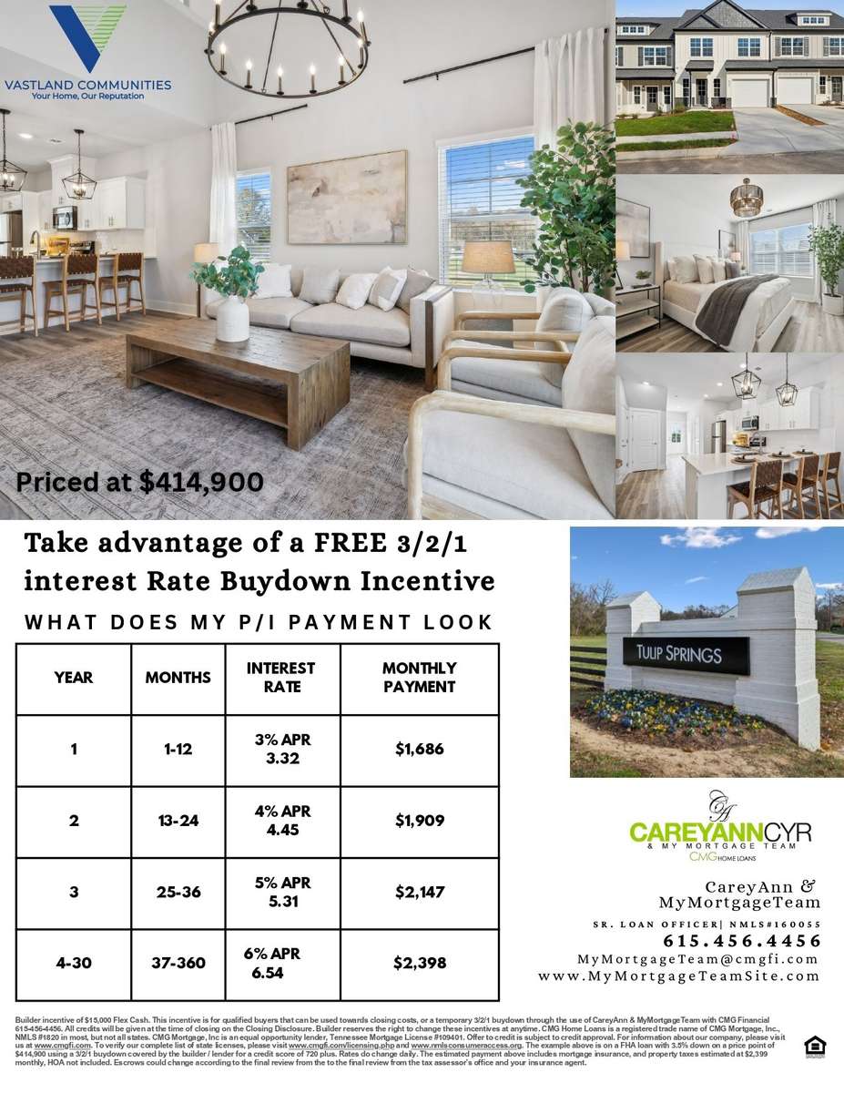 " MOVE- IN PACKAGE includes blinds, a refrigerator, washer, and dryer- everything you need to settle in comfortably from day one! PLUS $ 15, 000 Builder Incentive towards closing costs or upgrades when using our preferred lender and title company- Expires December 31, 2025! PRIMARY on MAIN LEVEL with One Car Garage - Tulip Springs is a new construction townhome community in Hermitage. This community is situated in a convenient location near the Nashville airport and short drive to the heart of Music City, with easy access to interstate, restaurants, entertainment, and shopping venues. These exclusive homes feature a one- car garage and Primary Suite w/ Gorgeous Bath & Lg WALK- IN CLOSET. You will find value in the designer- selected finishes and custom features throughout the home. These homes provide an OPEN DESIGN, Incredible Gourmet Kitchen w/ Amazing Cabinet Storage, Spacious ISLAND, & PANTRY. You will enjoy the added WALK- IN STORAGE SPACE, it also backs up to a beautiful tree- line adding both PRIVACY and a PEACEFUL VIEW. Come experience vibrant & carefree living at these STUNNING homes designed by Vastland Communities! Walnut floor plan. MODEL HOME OPEN Wed- Sat 10am- 5pm, Sun 1pm- 5pm and Mon- Tues by appointment only.