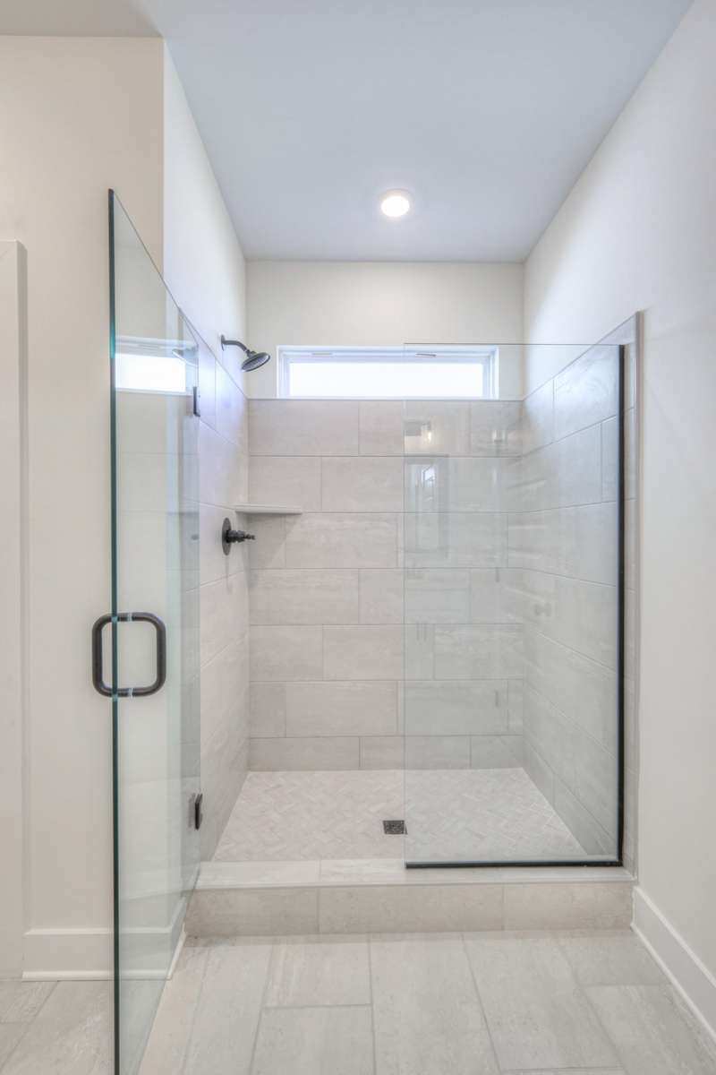Owner’s suite with a separate garden soaking tub and tile shower plus a frameless shower door for a sleek finish
