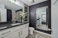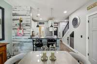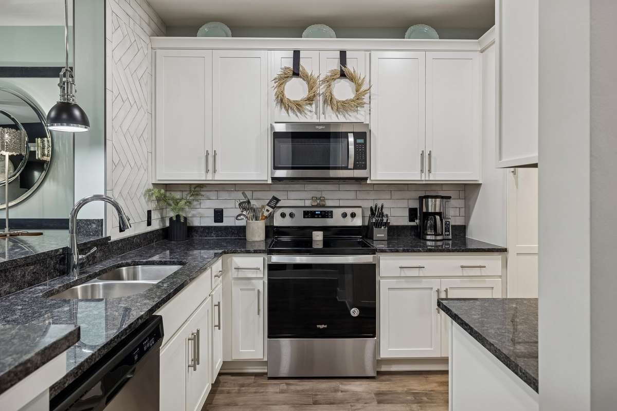 The chef- inspired kitchen is the true centerpiece of the home, featuring granite countertops, shaker- style cabinetry, and an elegant Spanish tile backsplash that adds a touch of Old World charm. Whether entertaining guests or enjoying quiet evenings in, this kitchen blends style and functionality effortlessly.