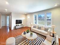 The large kitchen features ample cabinet space and a full appliance package. Situated