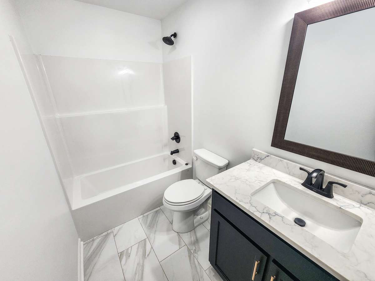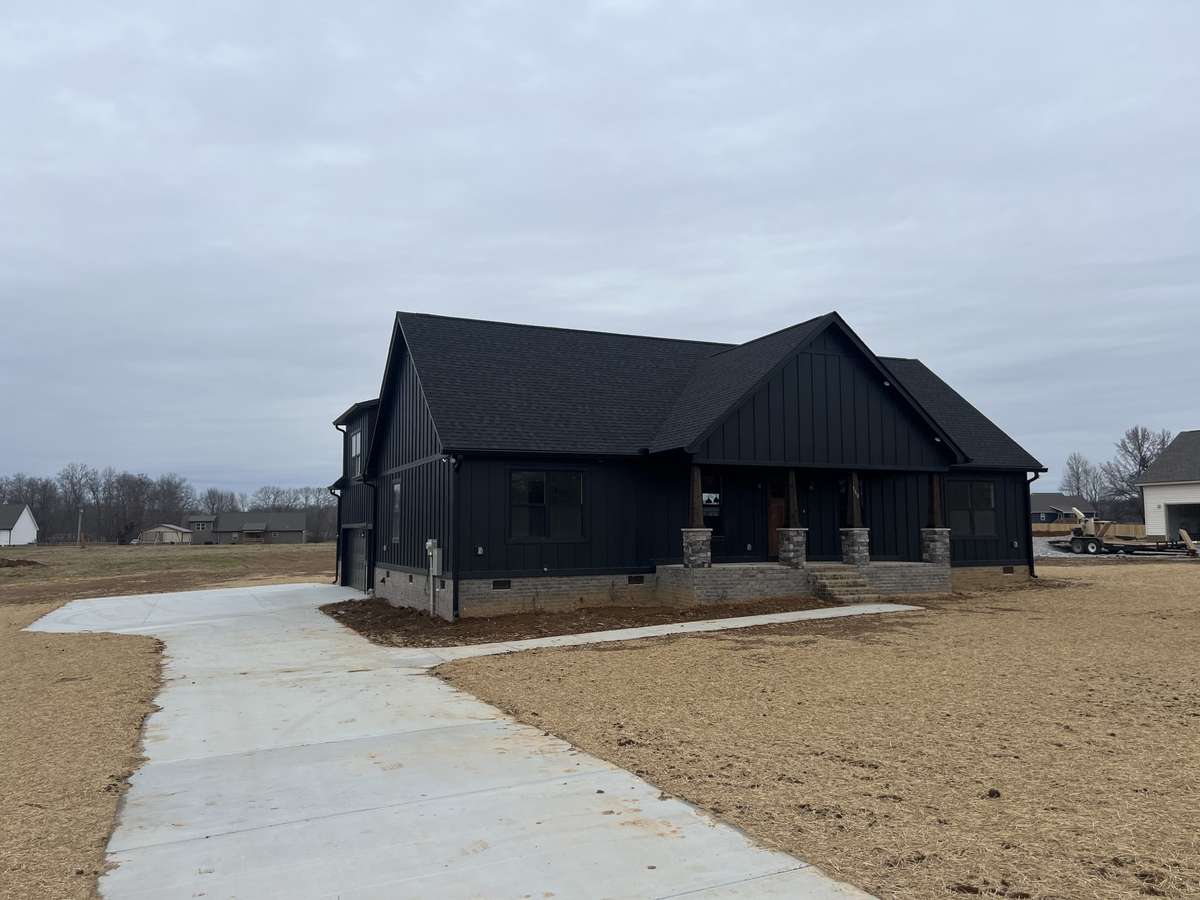 This stunning home showcases custom- built cabinets, quartz countertops, walk- in closets, custom light fixtures, and a luxurious primary bathroom featuring a separate soaking tub and tiled shower. The striking black Hardie board siding, covered front porch, and spacious back deck add to its curb appeal and outdoor enjoyment.