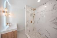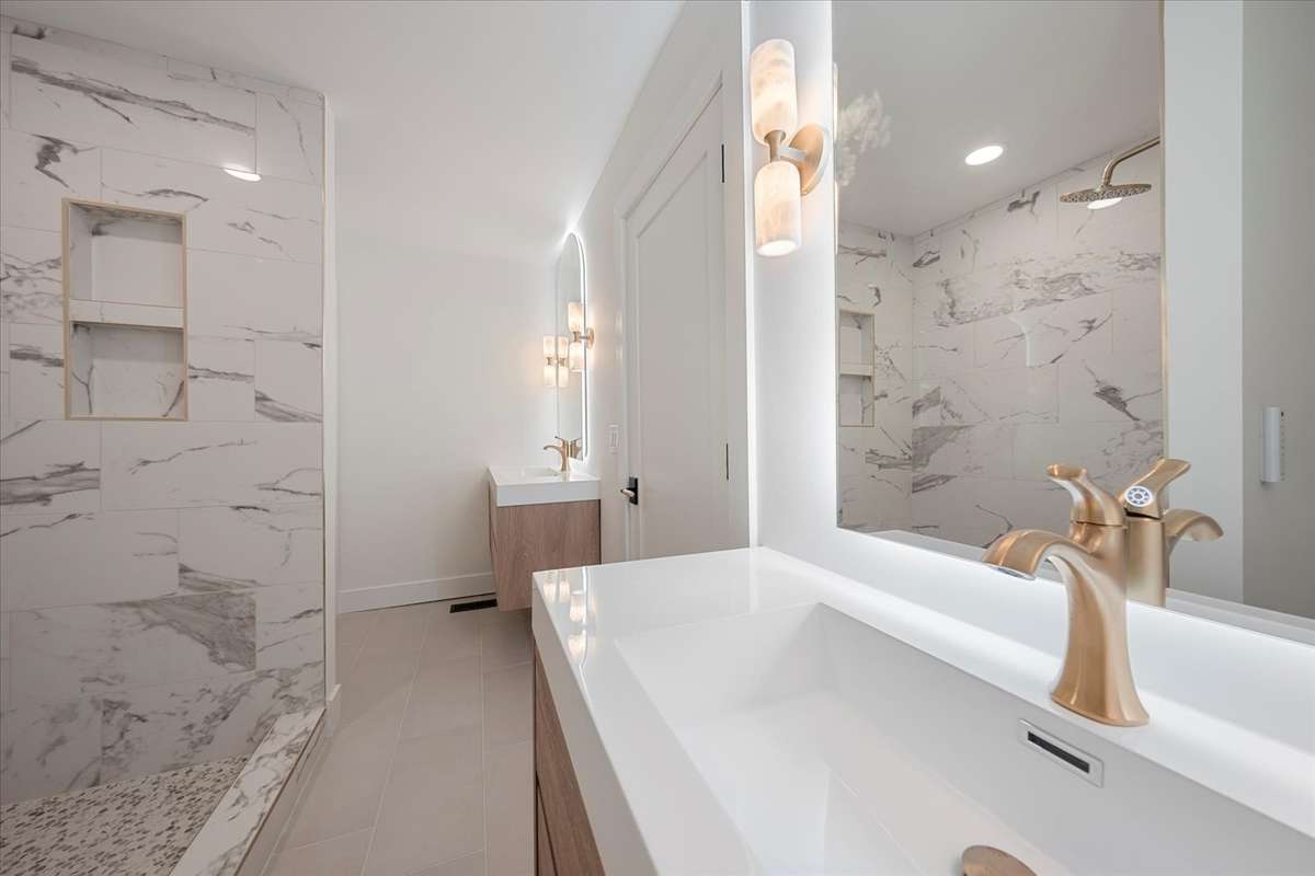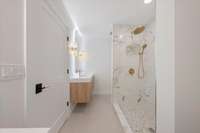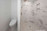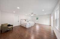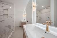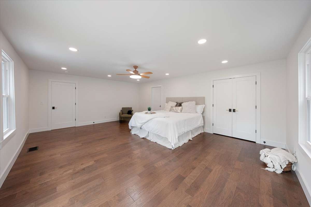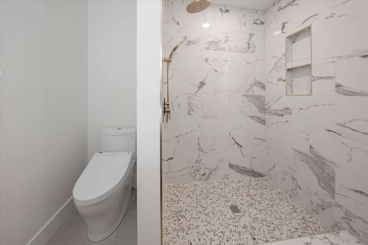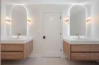 Unwind in the spacious master suite, complete with a walk- in closet, sitting area, and a spa- like bathroom featuring a smart toilet and light- up vanity mirrors.