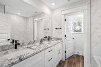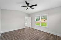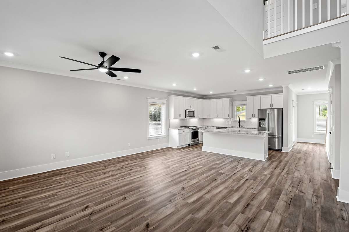 All bedrooms include walk- in closets and ceiling fans. The gourmet kitchen is equipped with stainless steel KitchenAid appliances, a tile backsplash, under- cabinet lighting, and premium plywood cabinetry. Elegant matte black finishes, crown molding, custom craftsman trim, vaulted ceilings, and blinds on every window add sophisticated touches throughout the home.