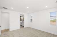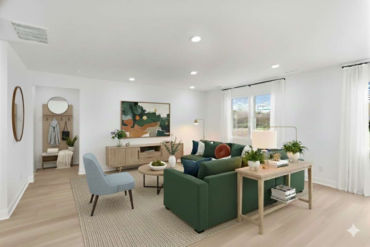Primary Sanctuary: The Deluxe Primary Suite is privately tucked away at the rear, featuring a large walk- in closet and deluxe bath for a quiet escape.