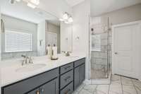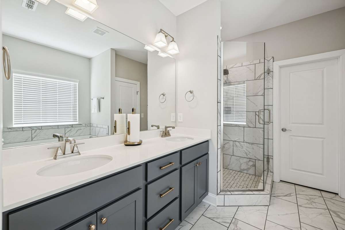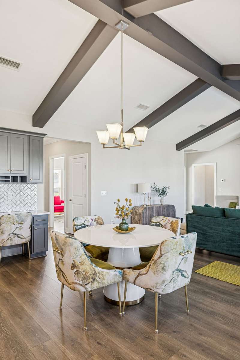 Upon entry, a versatile flex space welcomes you—perfect as a formal dining room, private home office, or cozy sitting room, offering adaptable functionality to suit your lifestyle. Natural light fills the home, highlighting wide- plank flooring, soaring ceilings, and a stunning great room with exposed beams and a dramatic floor- to- ceiling stacked- stone fireplace. The chef’s kitchen impresses with quartz countertops, custom gray cabinetry with gold hardware, stainless steel appliances including double ovens, a herringbone tile backsplash, elegant pendant lighting, and a spacious island ideal for gatherings. The open- concept design seamlessly connects the kitchen, dining, and living areas for effortless everyday living and entertaining.