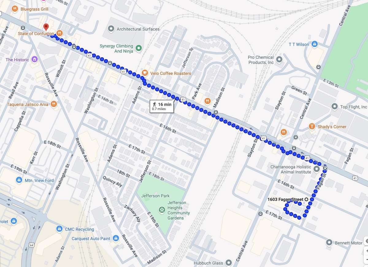 Via I 24 W toward Chattanooga. Take exit 180A to merge onto Rossville Blvd., turn right onto Polk St. Turn left onto E 16th Street. Turn left at the 1st cross street onto Fagan Street. Building will be on your right.