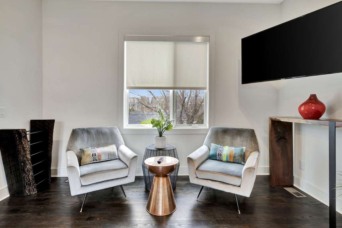 Three- story, corner unit townhome with high end finishes and thoughtful design. Mini in- law suite on main level with kitchenette that includes: fridge, cabinets, shelving, sink, microwave and storage. ELEVATOR with access to all floors including rooftop! Rooftop features built in wet bar and outdoor kitchen including: bev fridge and gas grill. Jacuzzi tub to remain & of course beautiful downtown views. Bedroom # 2 is designed for ADA if needed with zero entry shower. Custom window treatments throughout, Thermador range/ oven and vent hood in kitchen w/ large pantry & waterfall eat- in island. Wet bar in living room with 1 fireplace & juliet balcony, plus 2 car attached garaged w/ electric charging. All appliances to remain including washer/ dryer. * Exterior landscaping w/ HOA provided.