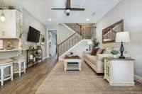 The bright, modern kitchen stands out with white cabinetry, soft- close doors and drawers, upgraded quartz countertops, under- cabinet lighting, a large gas range, and a top- tier appliance package. Ample workspace and a seamless flow to the dining and living areas make everyday living and entertaining effortless. Throughout the home, upgraded lighting enhances the warm, inviting feel.