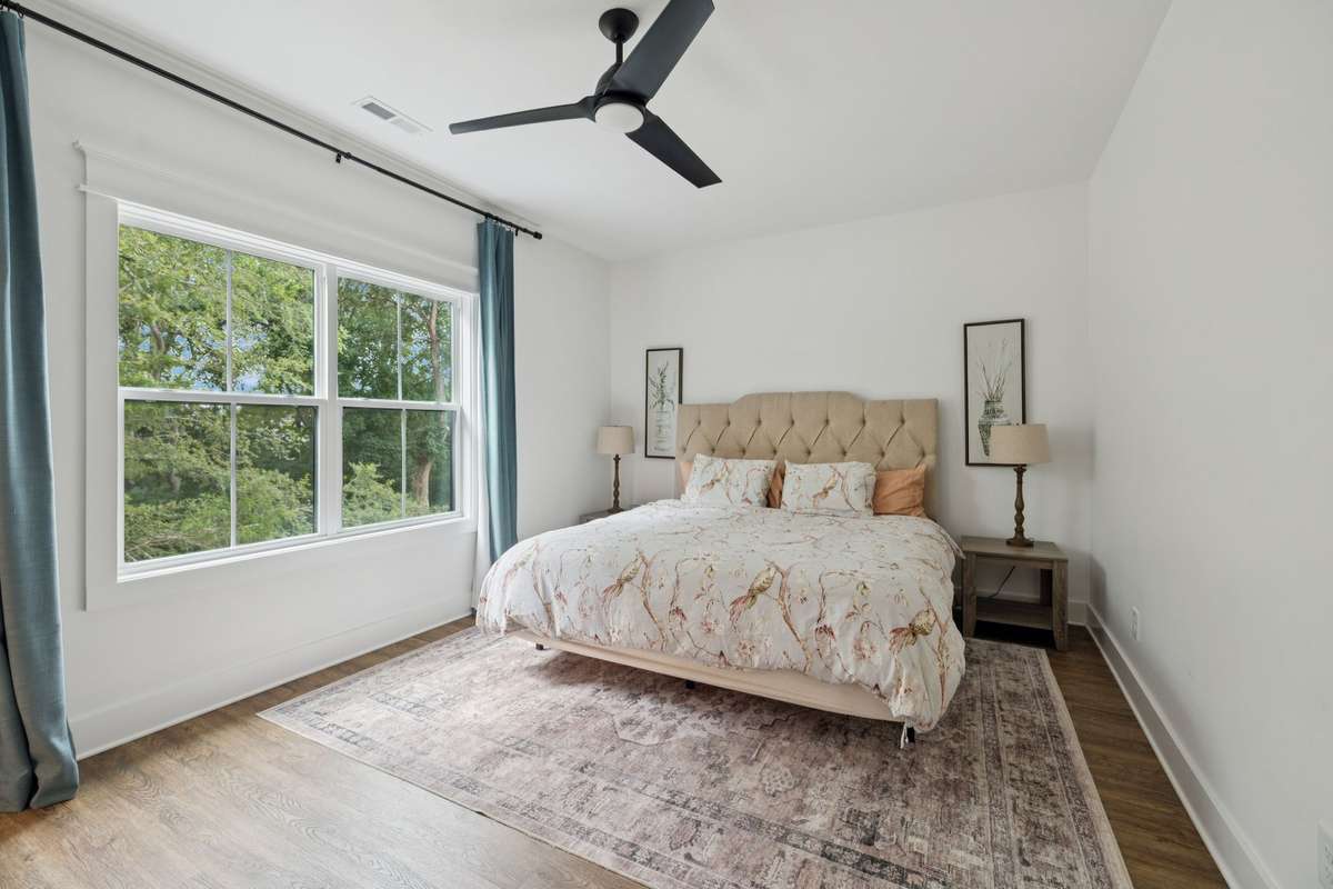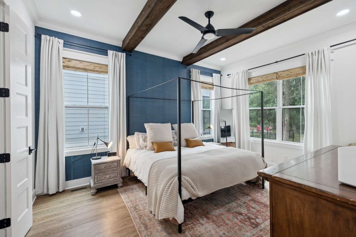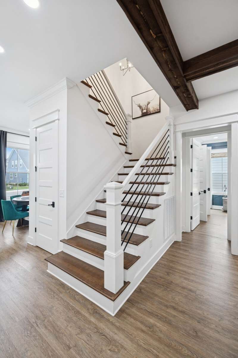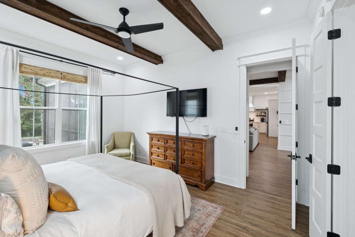 The main level features an inviting open concept living room with wood beams, a gas fireplace, and natural light pouring in from large windows. The kitchen is a chef’s delight with gas appliances, a vent hood, generous prep space, and a large island perfect for gathering. A breakfast nook and formal dining area make entertaining effortless. The primary suite is located on the first floor, complete with walk- in closets and a spa like bathroom featuring a soaking tub, oversized glass shower, and stunning tilework.