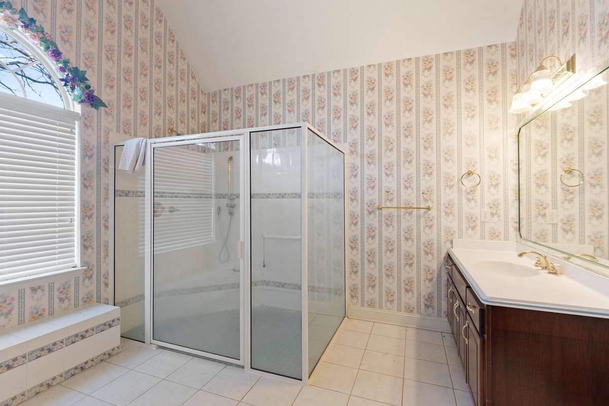 The heart of the home is a grand great room, complete with a gas fireplace, built- in bookcases and cabinets, and soaring 12- foot ceilings that create an inviting space for relaxation or entertaining. Additional living spaces include a flexible room that can serve as a living room or office, all enhanced by tall ceilings throughout the house. The well- equipped kitchen features double wall ovens, an electric cooktop, microwave, and solid surface countertops. Conveniently located off the Kitchen is the Laundry room, oversized to include a pantry and cabinetry over the washer and dryer.