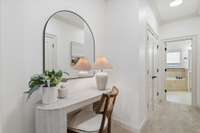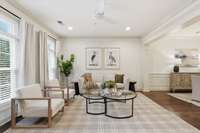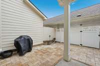 Outdoor living is just as impressive. The charming courtyard features travertine tile—perfect for relaxing, entertaining, or morning coffee. The fenced patio offers privacy and opens directly to green common space, ideal for pets or gardening.