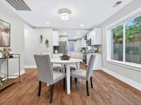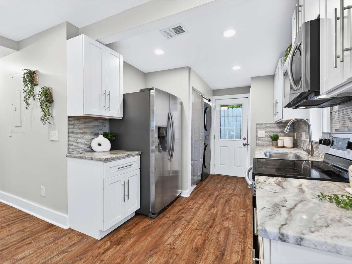 The Kitchen space is easy to navigate and has a pantry and stackable washer and dryer which convey with the home.