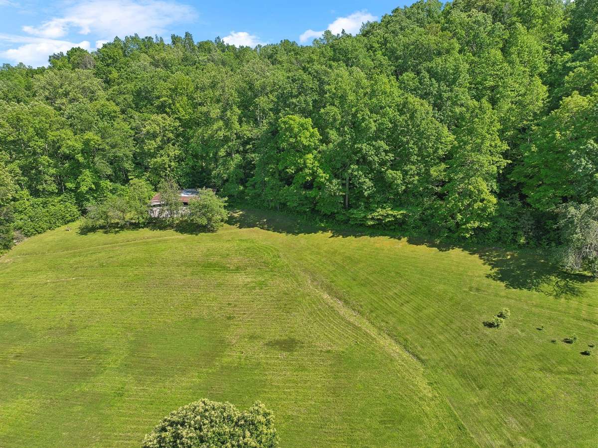 This breathtaking aerial view showcases the property's wooded privacy in the rear — a peaceful natural buffer that also leads to a scenic hilltop, offering a potential additional building site with endless possibilities.