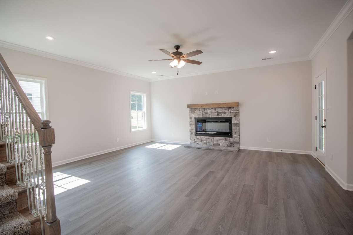 Large Living Room with a Stone Fireplace, Floating Wood Mantle, Crown Molding, Tons of Natural Lighting and Access to the Large Covered Patio!